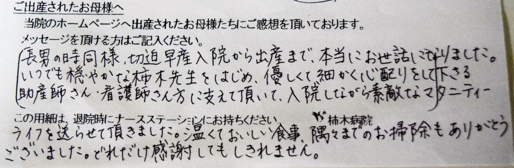 長男の時同様、切迫早産入院から出産まで、本当にお世話になりました。いつでも穏やかな柿木先生をはじめ、優しくて細かく心配りをして下さる助産師さん、看護師さん方に支えて頂いて、入院しながら素敵なマタニティーライフを送らせて頂きました。温かくておいしい食事、隅々までのお掃除もありがとうございました。どれだけ感謝してもしきれません。