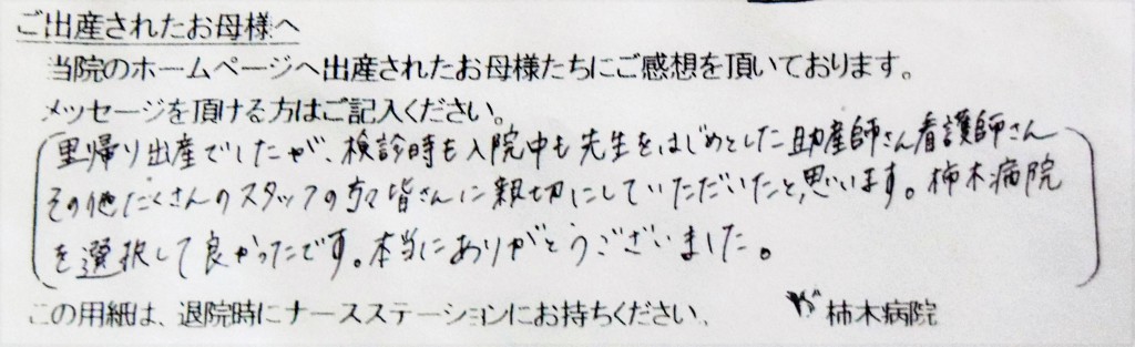 里帰り出産でしたが、検診時も入院中も先生をはじめとした助産師さん看護師さんその他たくさんのスタッフの方々皆さんに親切にしていただいたと思います。柿木病院を選択して良かったです。本当にありがとうございました。