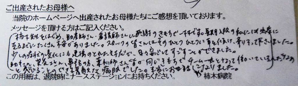 柿木先生をはじめ、助産師さん、看護師さんに感謝のきもちで一杯です。長期入院の私には出産に至るまでにたくさん不安がありました。スタッフの皆さんはそのひとつひとつに耳を傾け、寄り添って下さいました。少しの症状の変化にも連携のとれた対応で、日々安心して過ごすことができました。<br />