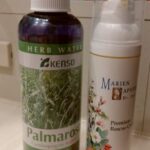 左の青いボトルは健草医学舎の「パルマローザウォーター」