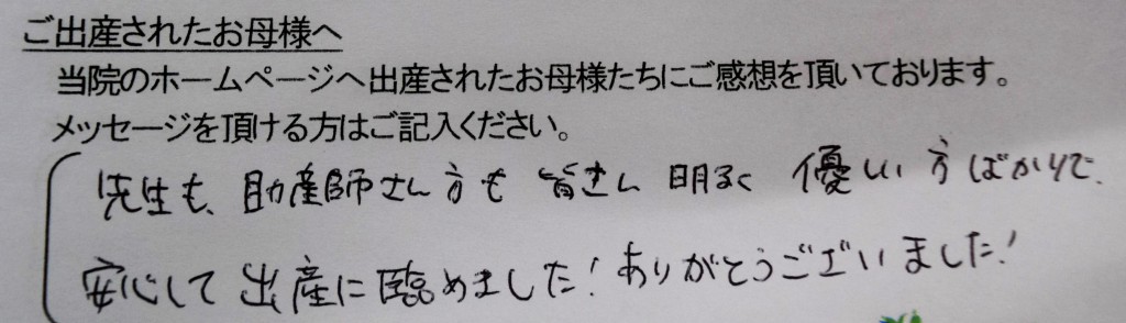 先生も、助産師さん方も皆さん明るく優しい方ばかりで、安心して出産に臨めました!<br />