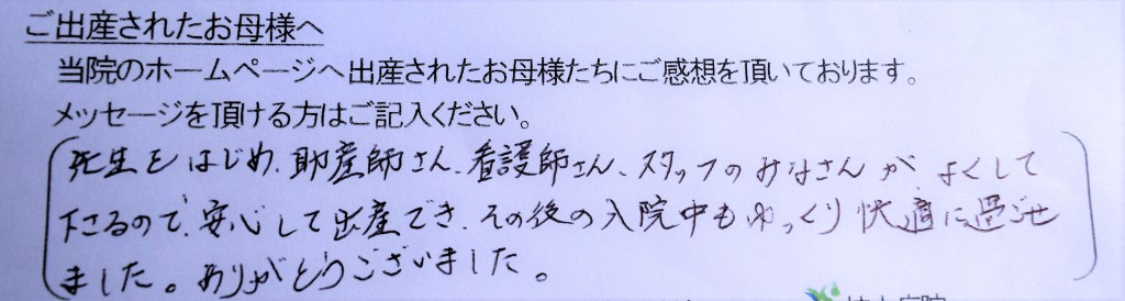 先生はじめ、助産師さん、看護師さん、スタッフの皆さんが良くして下さるので、<br />
