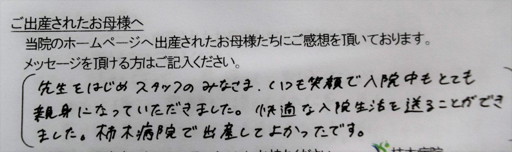 先生はじめ、スタッフのみなさま、いつも笑顔で入院中もとても親身になっていただきました。快適な入院生活を送ることができました。柿木病院で出産して良かったです。