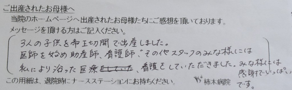 医師を始め助産師、看護師、その他のスタッフのみな様には私により沿った医療、看護をしていただきました。みな様には感謝でいっぱいです。