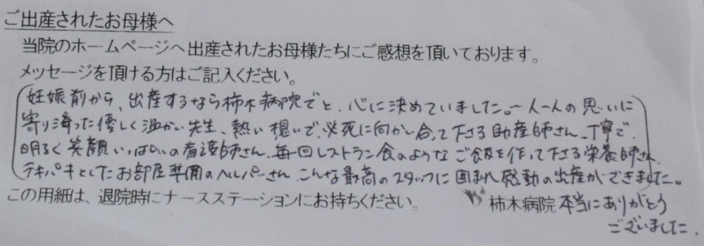 妊娠前から、出産するなら柿木病院でと心に決めていました。一人一人の思いに寄り添った優しく温かい先生、熱い想いで必死に向かい合って下さる助産師さん、丁寧で明るく笑顔いっぱいの看護師さん、毎回レストラン食のようなご飯を作って下さる栄養師さん、テキパキとしたお部屋準備のヘルパーさん。こんな最高のスタッフに囲まれ感動の出産ができました。本当にありがとうございました。