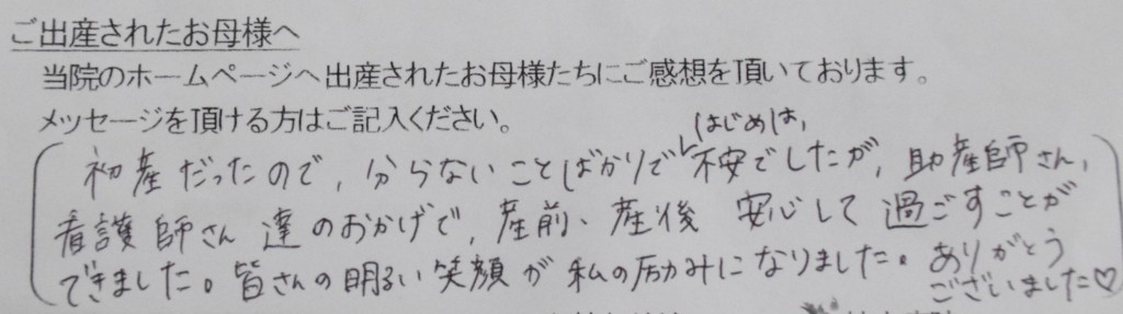 初産だったので、分からないことばかりではじまは不安でしたが、助産師さん、看護師さん達のおかげで、産前、産後安心して過ごすことができました。皆さんの明るい笑顔が私の励みになりました。ありがとうございました♡