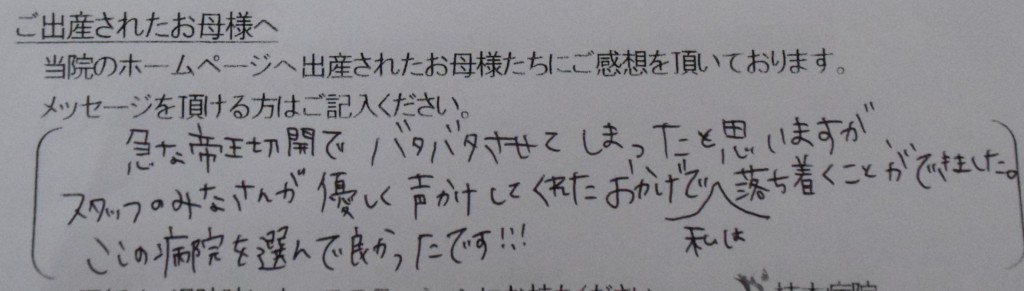 急な帝王切開でバタバタさせてしまったと思いますが、スタッフのみなさんが優しく声かけしてくれたおかげで、私は落ち着くことができました。ここの病院を選んで良かったです!!