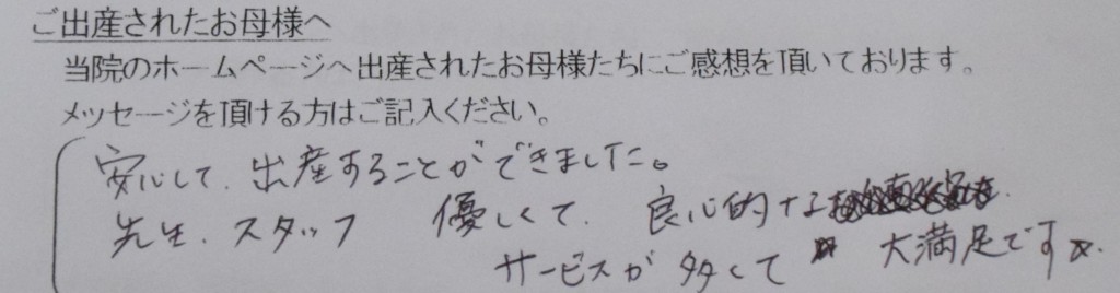 安心して出産することができました。先生、スタッフ、優しくて良心的なサービスが多くて大満足です☆<br />