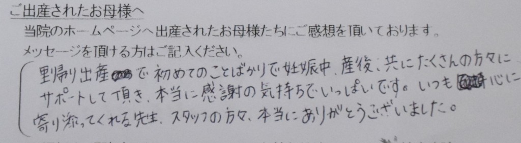 里帰り出産で初めてのことばかりで妊娠中、産後、共にたくさんの方々にサポートして頂き、 本当に感謝の気持ちでいっぱいです。いつも心に寄り添ってくれる先生、スタッフの方々、本当にありがとうございました。