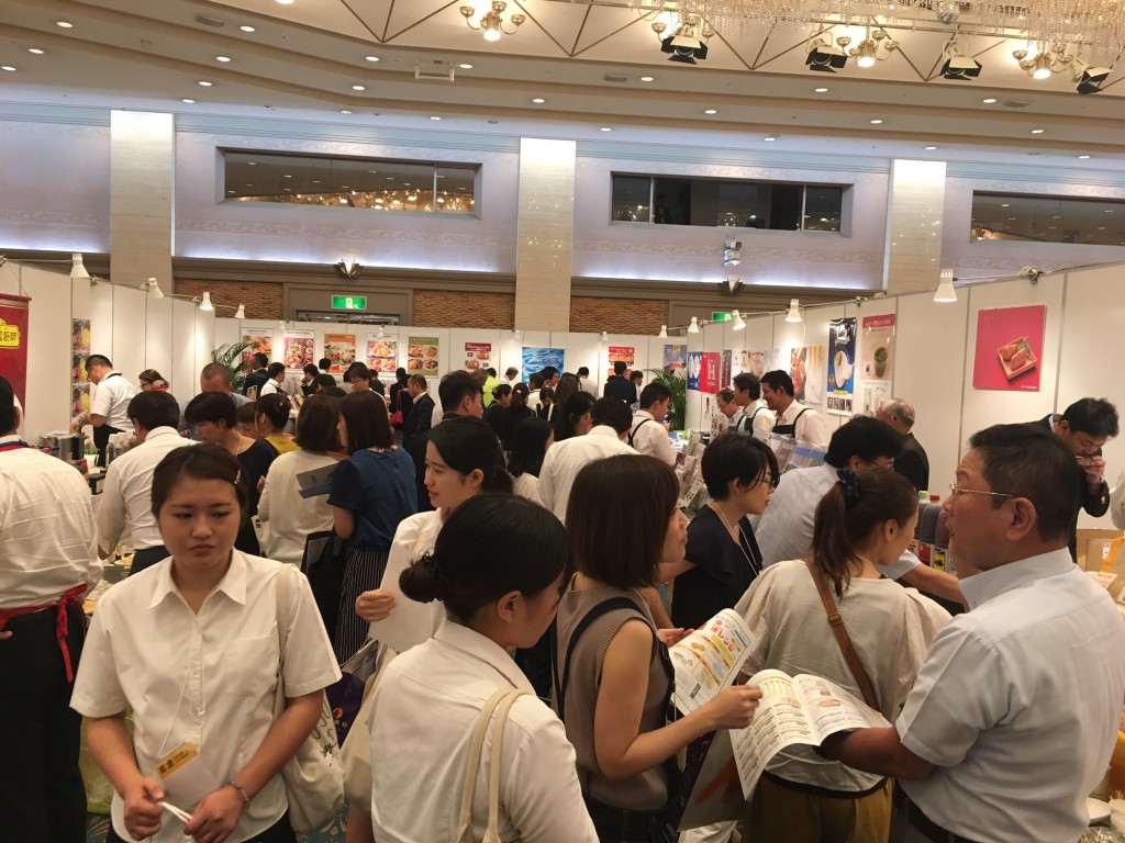 会場は城山観光ホテルの広い催事場で、約80社の食品業者さんがずらーっと商品を並べています。
