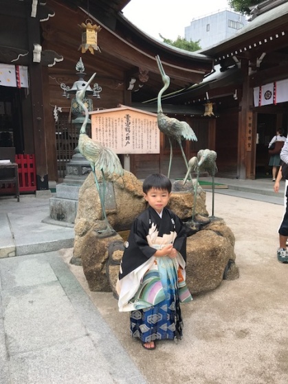 9/23は少し早い孫の七五三のお祝いを博多の櫛田神社で行いました。37歳になる息子が5歳の時に祖父母から送られた着物と袴を大事に保管していました。嫁から「お母さん、凄いですね。こんなに綺麗な状態で着物を置いていたんですか??」と褒められた着物と袴を孫に着せると、パパそっくり!!これも凄い!!