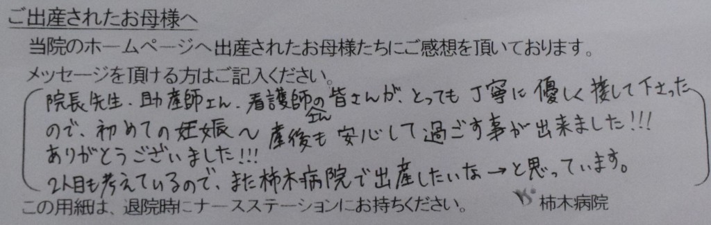 院長先生、助産師さん、看護師さんの皆さんが、とっても丁寧に優しく接して下ったので、初めての妊娠~産後も安心して過ごすことが出来ました!!ありがとうございました!!2人目も考えているので、また柿木病院で出産したいなーと思っています。