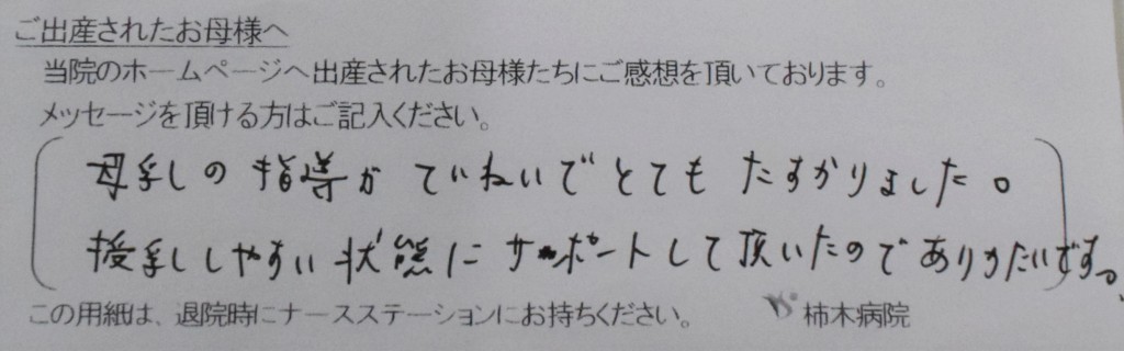 母乳の指導がていねいでとてもたすかりました。授乳しやすい状態にサポートして頂いたのでありがたいです。