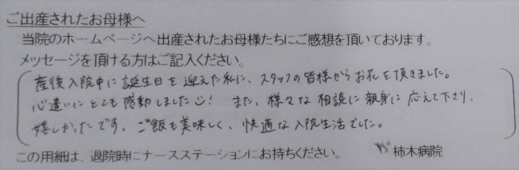 産後入院中に誕生日を迎えた私にスタッフの皆様からお花を頂きました。心遣いにとても感動しました!また、様々な相談に親身に応えて下さり、嬉しかったです。ごはんも美味しく、快適な入院生活でした。
