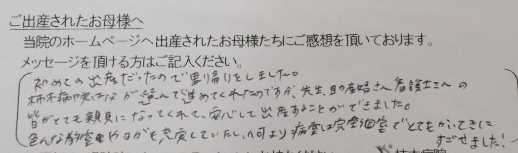 柿木病院は父が選んで進めてくれたのですが、先生、助産師さん、看護師さんの皆がとても親身になってくれて、安心して出産することができました。<br />
