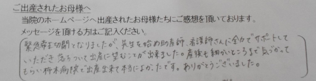 緊急帝王切開となりましたが、先生を始め助産師、看護師さんに全力でサポートしていただき落ち着いて出産に臨むことが出来ました。産後も細かいところまで気遣ってもらい、柿木病院で出産出来て本当によかったです。ありがとうございました。