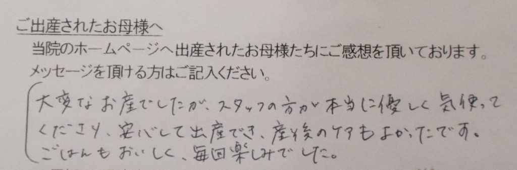 大変なお産でしたが、スタッフの方が本当に優しく気遣ってくださり、安心して出産でき、産後のケアもよかったです。<br />