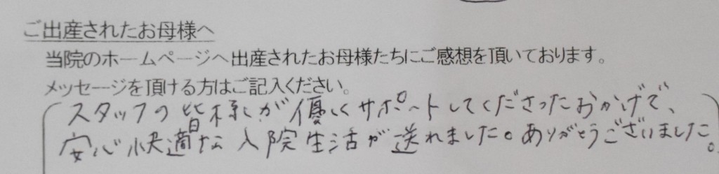 スタッフの皆様が優しくサポートしてくださったおかげで、安心快適な入院生活が送れました。ありがとうございました。