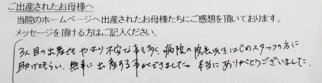 3人目の出産でもやはり不安な事も多く、病院の院長先生はじめスタッフの方に助けてもらい、無事に出産する事ができました。<br />