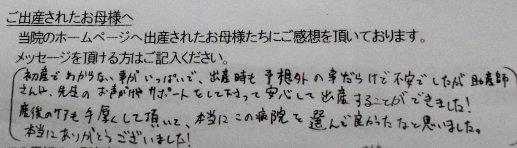 初産でわからない事がいっぱいで、出産時も予想外の事だらけで不安でしたが、助産師さんや先生のお声がけやサポートをして下さって安心して出産することができました!産後のケアも手厚くして頂いて、本当にこの病院を選んで良かったなと思いました。本当にありがとうございました!