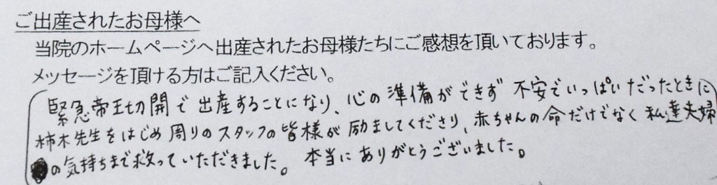 緊急帝王切開で出産することになり、心の準備ができず不安でいっぱいだったときに、柿木先生はじめ周りのスタッフの皆様が励ましてくださり、赤ちゃんの命だけでなく、私達夫婦の気持ちまで救っていただきました。本当にありがとうございました。