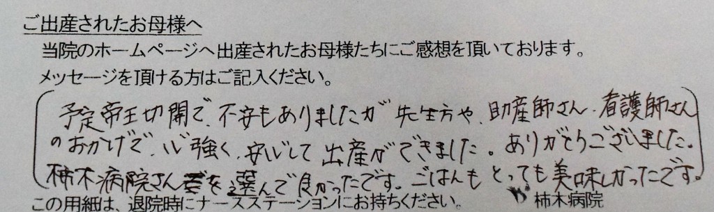 予定帝王切開で不安もありましたが、先生方や助産師さん、看護師さんのおかげで心強く安心して出産ができました。ありがとうございました。柿木病院を選んで良かったです。ごはんもとっても美味しかったです。