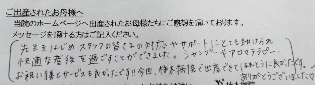 先生はじめ、スタッフの皆さまの対応やサポートにとても助けられ、快適な産後を過ごすことができました。シャンプーやアロマテラピー、お祝い膳とサービスも良かったです!!今回、柿木病院で出産できてほんとうに良かったです。ありがとうございました♡