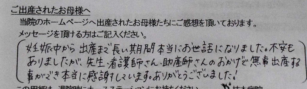 妊娠中から出産まで長い期間本当にお世話になりました。不安もありましたが、先生・看護師さん・助産師さんのおかげで無事出産する事ができ本当に感謝しています。ありがとうございました!