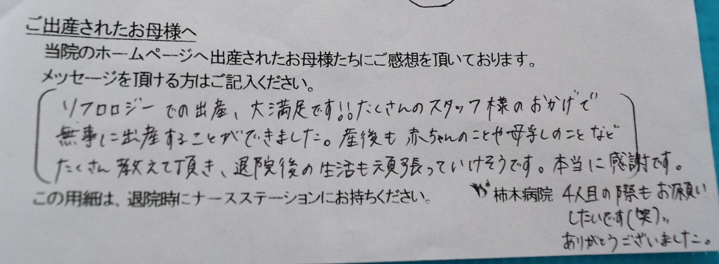 ソフロロジーでの出産、大満足です!!たくさんのスタッフ様のおかげで無事に出産することができました。産後も赤ちゃんのことや母乳のことなどたくさん教えて頂き、退院後の生活も頑張っていけそうです。本当に感謝です。4人目の際もお願いしたいです(笑)ありがとうございました。