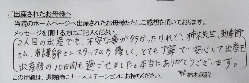 2人目の出産でも、不安な事が多かったけれど、柿木先生、助産師さん、看護師さんスタッフの方優しく、とても丁寧で安心して出産も出産後の10日間も過ごせました。本当にありがとうございます。