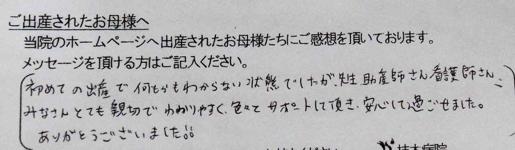 初めての出産で何もかもわからない状態でしたが、先生、助産師さん、看護師さん、みなさんとても親切でわかりやすく色々とサポートして頂き、安心して過ごせました。ありがとうございました!!