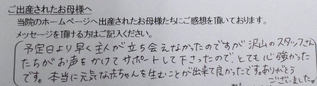 予定日より早く主人が立ち会えなかったのですが、沢山のスタッフさんたちがお声をかけてサポートしてくださったので、とても心強かったです。本当に元気な赤ちゃんを生むことが出来て良かったです。ありがとうございました。