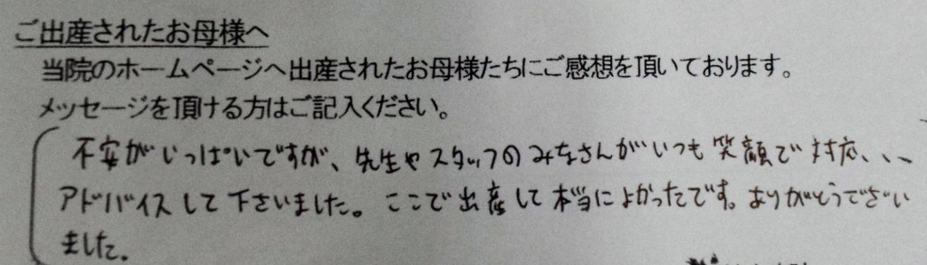 不安がいっぱいですが、先生やスタッフのみなさんがいつも笑顔で対応し、アドバイスをしてくださいました。ここで出産して本当によかったです。ありがとうございました。