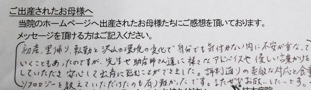 初産、里帰り、転勤と沢山の環境の変化で自分でも気付かない内に不安が重なっていくこともあったにですが、先生や助産師さん達に様々なアドバイスや優しい言葉かけをしていただき、安心して出産に臨むことができました。評判通りの素敵な対応と食事。ソフロロジーを教えていただけたのも有難かったです。<br />