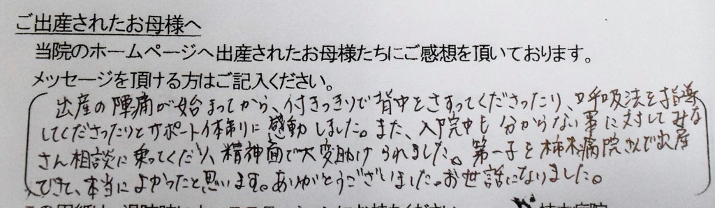 出産の陣痛が始まってから、付きっきりで背中をさすってくださったり、呼吸法を指導してくださったりとサポート体制に感動しました。また、入院中も分からない事に対してみなさん相談に乗ってくださったり、精神面で大変助けられました。第一子を柿木病院さんで出産できて、本当によかったと思います。<br />