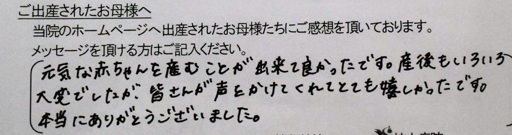 元気な赤ちゃんを産むことが出来て良かったです。産後もいろいろ大変でしたが、皆さんが声をかけてくれてとても嬉しかったです。<br />