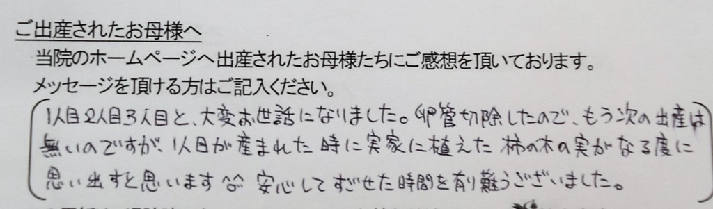 1人目2人目3人目と、大変お世話になりました。卵管切除したので、もう次の出産は無いのですが、1人目が産まれた時に実家に植えた柿の木の実がなる度に思い出すと思います☻安心してすごせた時間有り難うございました。