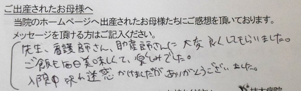 先生、看護師さん、助産師さんに大変良くしてもらいました。ご飯も毎日美味しくて楽しみでした。<br />
