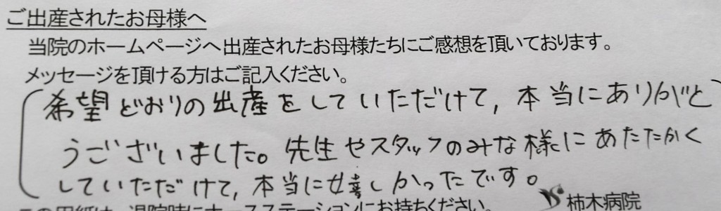 希望どおりの出産をしていただけて、本当にありがとうございました。先生やスタッフのみな様にあたたかくしていただけて、本当に嬉しかったです。