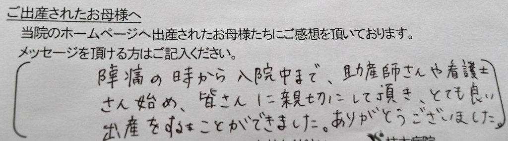 陣痛の時から入院中まで、助産師さんや看護士さん始め、皆さんに親切にして頂き、とても良い出産をすることができました。ありがとうございました。
