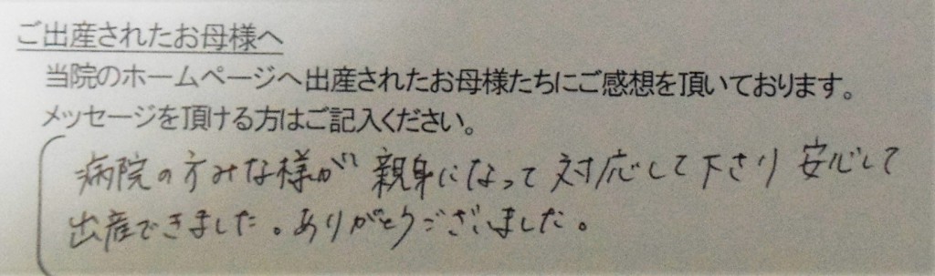 病院の方みな様が親身になって対応して下さり安心して出産できました。ありがとうございました。