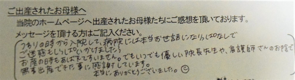 お産の時もあばれてすいません。でもいつでも優しい院長先生や、看護師さんのお陰で無事出産できた事に感謝しています。<br />