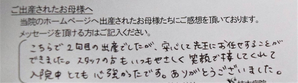 こちらで2回目の出産でしたが、安心して先生にお任せすることができました。スタッフの方もいつもやさしく笑顔で接してくれて入院中とても心強かったです。<br />