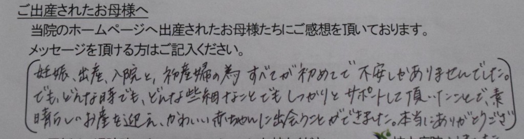 妊娠、出産、入院と初産婦の為すべてが初めてで不安しかありませんでした。でも、どんな時でもどんな些細なことでもしっかりとサポートして頂いたことで、素晴らしいお産を向かえ、かわいい赤ちゃんに出会うことができました。本当にありがとうございました。