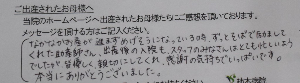 なかなかお産が進まずめげそうになっている時、ずっとそばで励ましてくれた助産師さん、出産後の入院もスタッフのみなさんはとても忙しいようでしたが、みな優しく、親切にしてくれ、感謝の気持ちでいっぱいです。本当にありがとうございました。