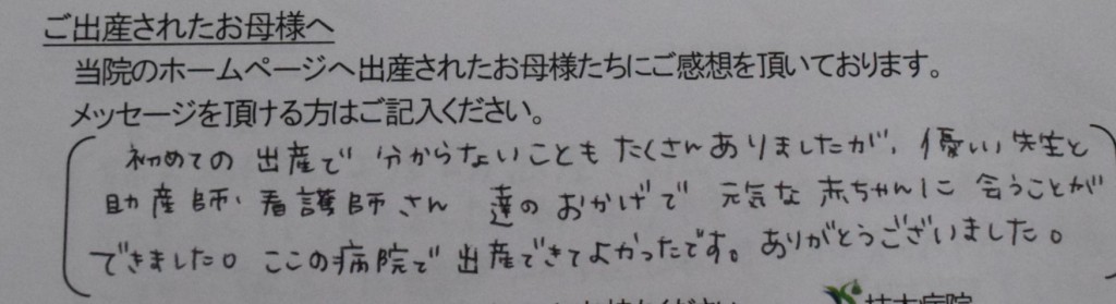 初めての出産で分からないこともたくさんありましたが、優しい先生と助産師・看護師さん達のおかげで元気な赤ちゃんに会うことができました。ここの病院で出産できてよかったです。ありがとうございました。
