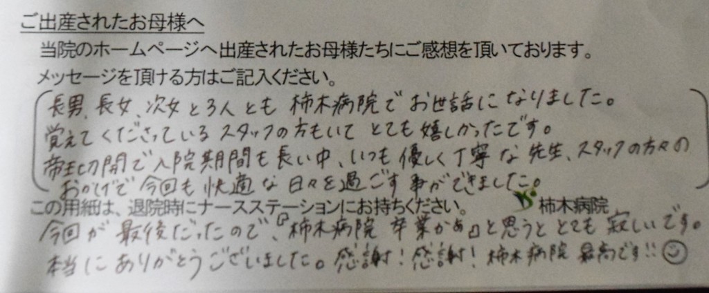 長男、長女、次女と3人とも柿木病院でお世話になりました。覚えてくださっているスタッフの方もいて、とても嬉しかったです。<br />