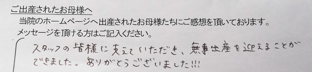 スタッフ皆様に支えていただき、無事出産を迎えることができました。ありがとうございました!!
