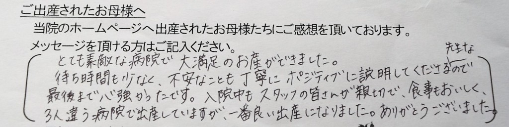 待ち時間も少なく、不安なことも丁寧にポジティブに説明してくださる先生なので最後まで心強かったです。入院中もスタッフの皆さんが親切で、食事もおいしく、3人違う病院で出産していますが、一番良い出産になりました。ありがとうございました。