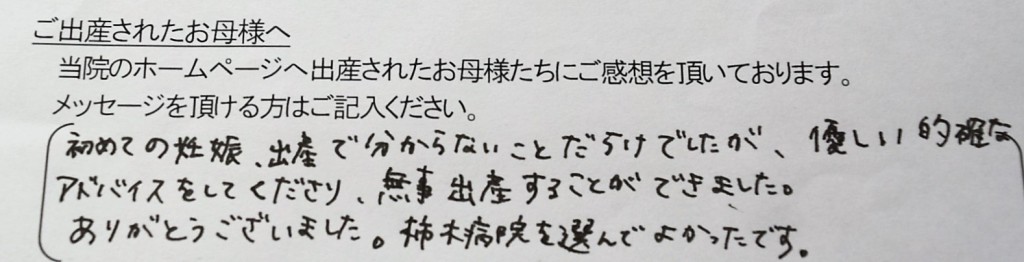 初めての妊娠、出産で分からないことだらけでしたが、優しい的確なアドバイスをしてくださり、無事出産することができました。ありがとうございました。<br />